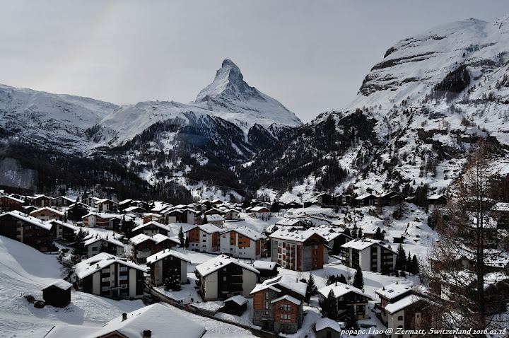 我們在主街上閒晃,被一條靜謐但陡峭的小徑吸引,沿著它往上走,兩道建築全是木造的,而且大多有干欄式高架設計,猜是怕木頭腐爛吧。這條小徑引著我們來到一處高點,可以俯瞰整個Zermatt小鎮,兩側氣勢萬鈞的覆雪山脈,夾著Zermatt密集的建築群,即便之中活耀著各種觀光活動,放眼望去還是在百雪靄靄中感受得到一片祥和寧靜。