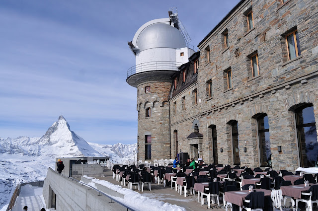 從Gornergrat車站往山脊上看,有座龐大的人造建築,是位在海拔3100M的旅館,另設有餐廳、瞭望台、和天文台。因為天氣太冷了,溫度只剩-6℃,我們短暫地躲進建築裡取暖,但很快地又被外頭的冰天雪地吸引出去了。