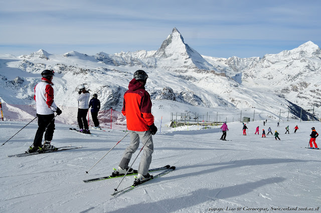10:09AM火車登上Gornergrat站,鐵軌幾乎被雪覆蓋,一下車直接進入天地皆白的世界,車門對著露天電子驗票口,出去緊臨的就是滑雪道了,滿車滑雪客從車廂傾巢而出,驗票後各自在雪地上找個空間套雪板,然後咻~~咻~~咻~~陸續往山下滑,一位、兩位、三位.....,除了我們這些不滑雪的觀光客零零落落的身影外,大蓋只花了10分鐘就幾乎人去雪空了,