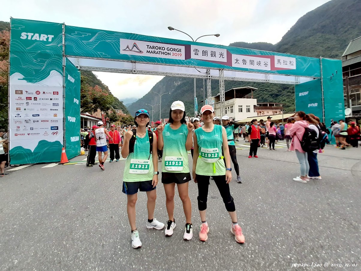 11月2日清晨四點起床,四點半出門,五點抵達新城火車站搭接駁車,五點半抵達太魯閣,花40-50分鐘走上遊客中心寄物後再折返回起跑點,排隊上廁所後順利擠到起跑門前,一切流程跟去年一模一樣,五次參賽經驗足以稱為老手了,還有充足的時間與東西橫貫公路牌坊和起跑拱門合照。